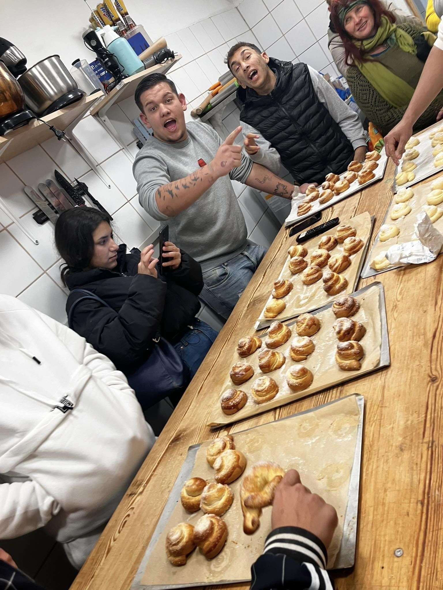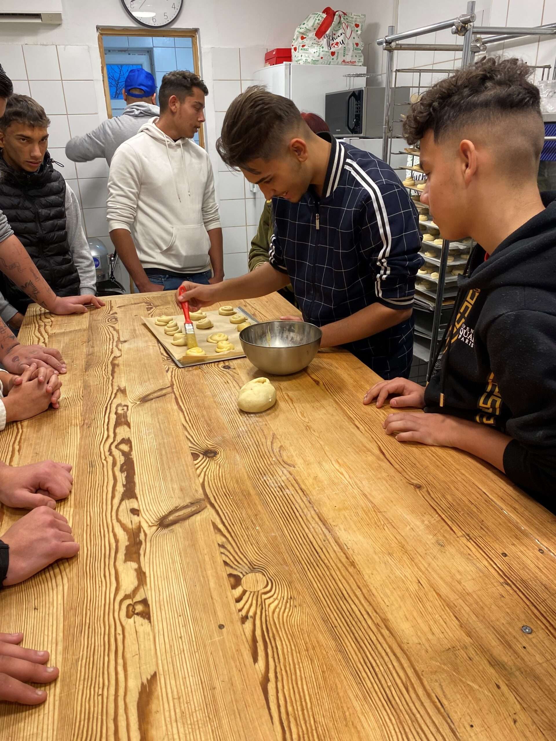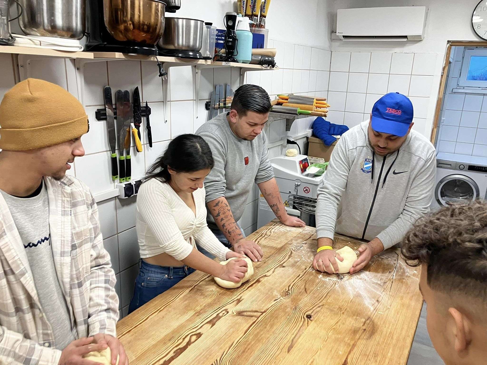 Az első ilyen alkalmon személyesen is részt vettünk, hiszen Alexszal és a gyerekkel is szerettünk volna találkozni. Két intézményből érkeztek a lelkes „péktanoncok”, a miskolci Dr. Ámbédkar Iskola diákjai mellett, a felsőzsolcai lakásotthon néhány fiatalja is részt vett a programon. A tizenévesek örömmel vetették bele magukat a munkába, ezért igazán jó hangulatban és gyorsan készült el 150 briós. Természetesen a munkájuk gyümölcsét rögtön el is fogyaszthatták. Bízunk benne, hogy a finom eredmény további motivációt jelent számukra, és hogy ők, illetve más környékbeli gyermekotthonok fiataljai is rendszeresen eljárnak majd Alex képzéseire.